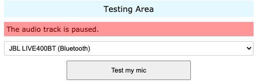 When I have my JBL 400BT headphones connected to my computer, the audio out works fine, but I can't get the audio in (microphone) to work properly. I've tried forgetting the device and reconnecting, restarting my macbook, and I used mictest.net to try to test the mic. When I switch the audio input to my headphones I get this message on mictest.net: